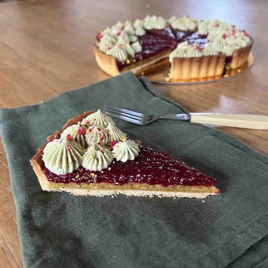 Raspberry & Pistachio tart requires a 48hrs pre-order notice